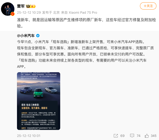 12月12日上午11点,小米汽车宣布“现车选购”新增准新车上架开售。这一消息迅速引发市场关注,小米集团创始人、董事长兼CEO雷军随即在个人微博作出解释。